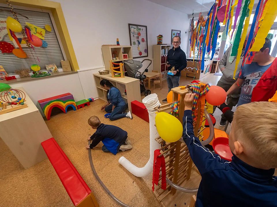 „Spielen und informieren“ hieß die Devise am Nachmittag: Zahlreiche Spiel- und Lernmöglichkeiten – von Experimentieren über Edelsteinsuche bis hin zum Eierlauf – gab es am Nachmittag für die kleinen Gäste. Groß an kam der Besuch von Polizei, Feuerwehr und Rotem Kreuz, die Einsatzfahrzeuge mitgebracht hatten und den Kindern spielerisch ihre Arbeit vorstellten. Die Erwachsenen – darunter Eltern künftiger Kita-Kinder – konnten sich die Einrichtung ansehen und sich über das Konzept informieren. Groß an kam auch eine Tombola, für deren Preise viele Firmen und Organisationen gespendet hatten.