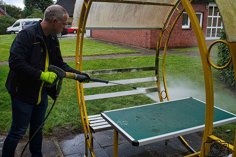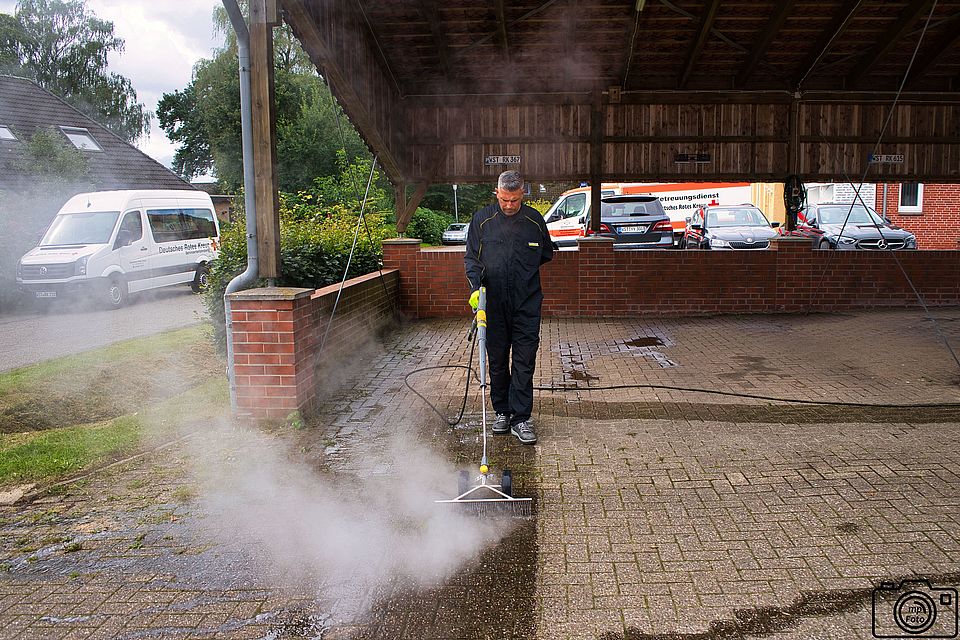 „Das Gute mit dem Nützlichen verbinden“ – so lautet ein altes Sprichwort – und bei der nachfolgend formulierten Aktion trifft es den Kern: „Bei unseren zweitätigen Meeting in Westerstede haben wir eine professionelle Reinigung – kostenlos – eingebaut“, erklärt Jürgen Olbrant, Regionaler Verkaufsleiter Professional Sales der Firma Kärcher. Die Aktion fand auf dem Gelände des Deutschen Roten Kreuzes in Westerstede – Hüllstede statt.